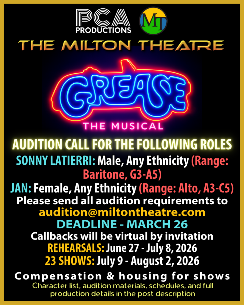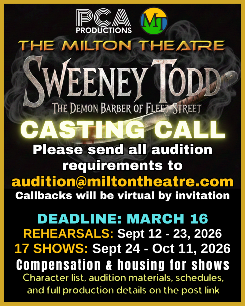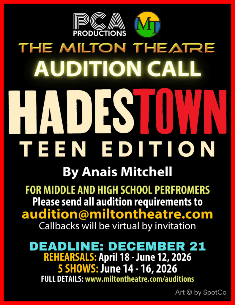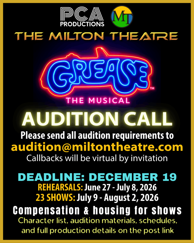 The audition process at the Milton Theatre is a welcoming and supportive experience that encourages performers to showcase their unique talents and abilities. Artists who book our shows are valued for their talent and hard work and compensated accordingly with competitive and fair pay.